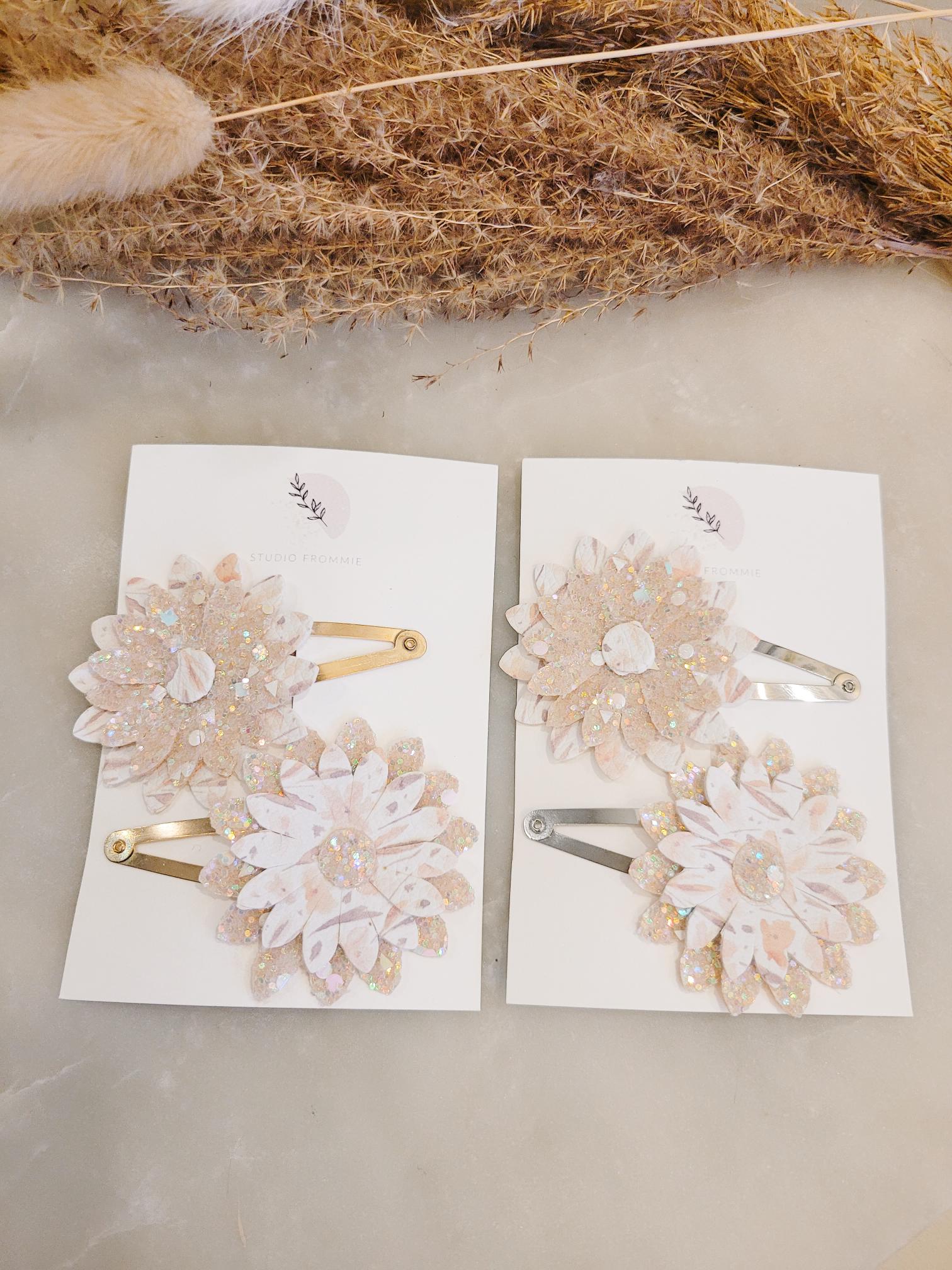 This set of hair clips is a real must-have for spring and summer! The combination of plain leather with glitter leather makes each clip a gem to wear. The clips are 5 cm and available in silver or gold.